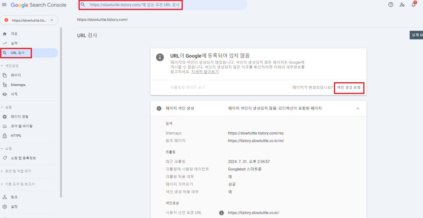 상단 url 검색 > 가운데 색인 생성 요청