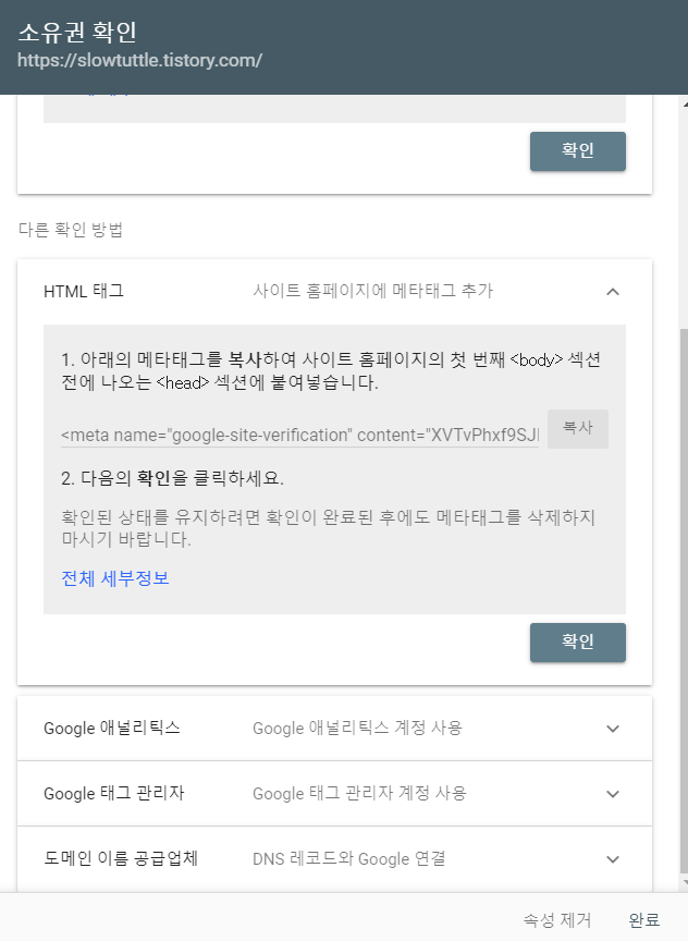인증 방법은 다양하게 있지만 HTML 태그 방식이 편리해서 해당 방식으로 인증했다.