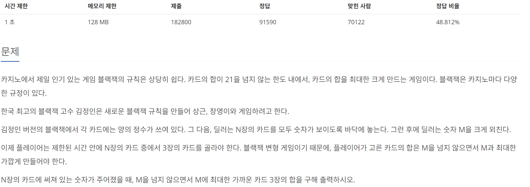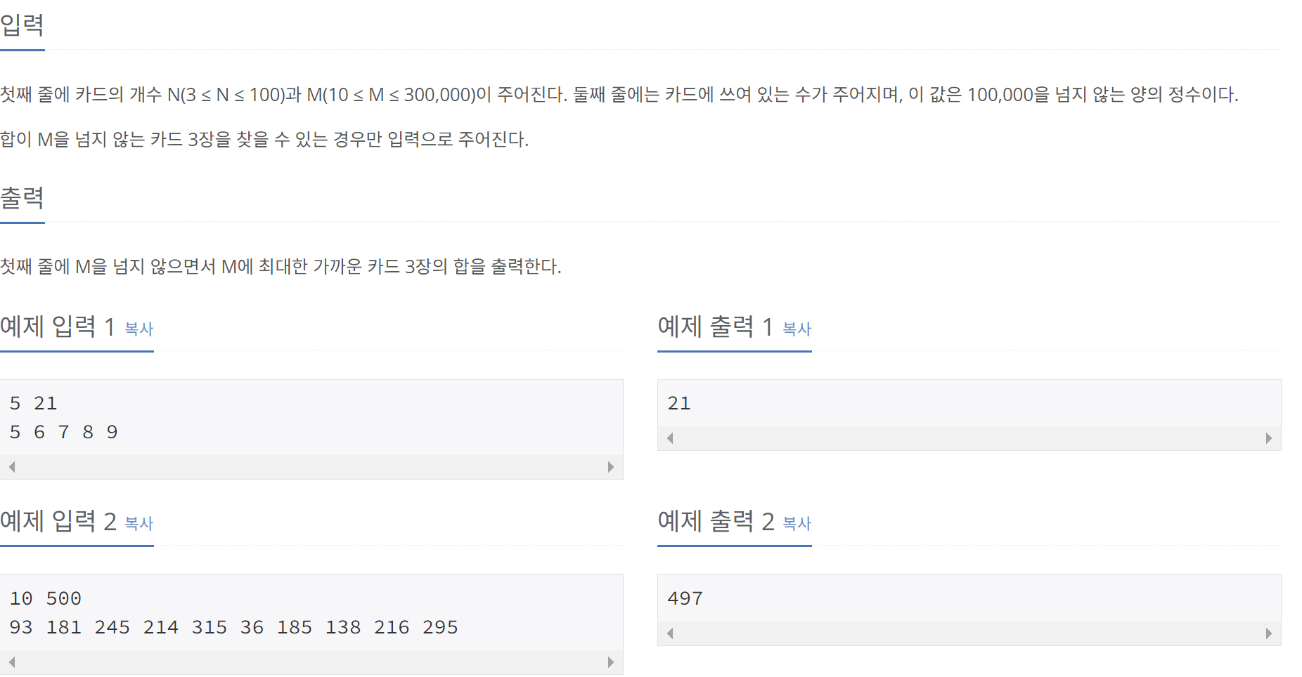 단순히 세장의 카드를 골라서 최대값보다 크면 제외 하는 식으로 찾으면 될 것 같다고 판단.