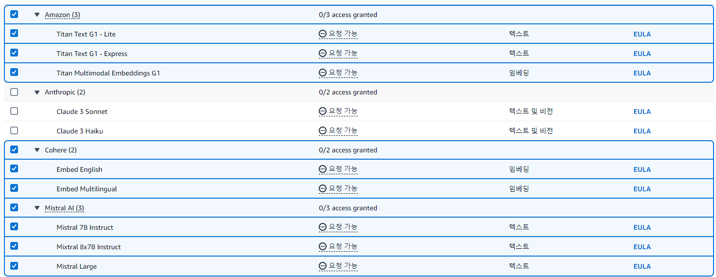 Antropic 모델은 신청 하려고 하니 회사명, 회사 홈페이지 URL 등의 정보를 입력해야 하는 것을 보니 기업용 서비스 인 것 같아서 제외하고 요청!!!!