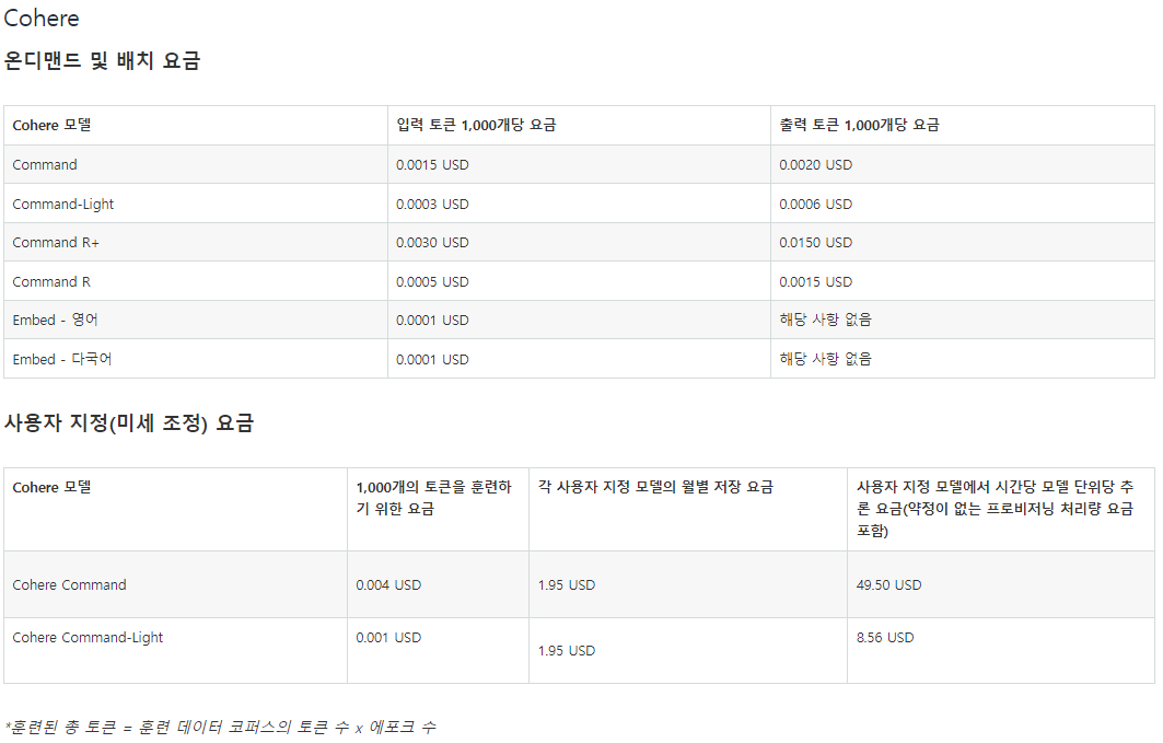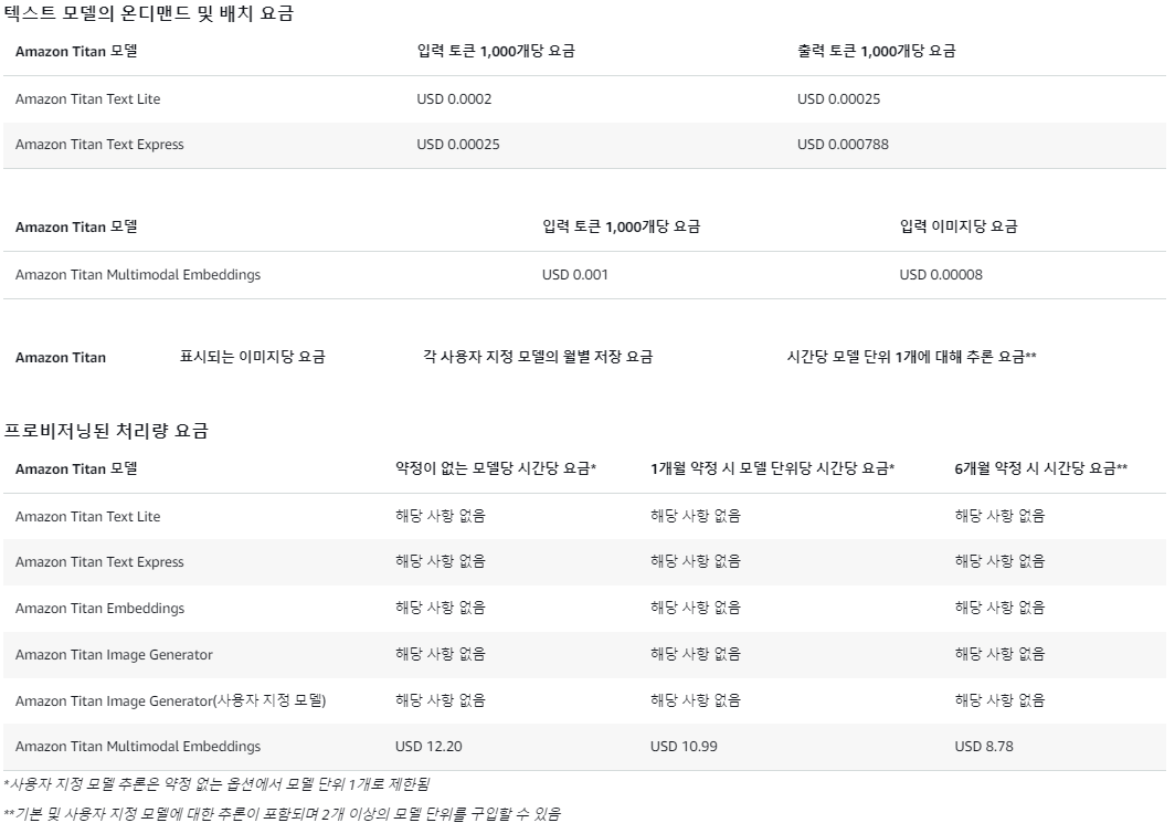 | 온디멘 | 온디맨드 모드에서는 기간 약정 없이 사용한 만큼만 비용을 지불하면 됩니다. - 텍스트 생성 모델의 경우 처리된 모든 입력 토큰과 생성된 모든 출력 토큰에 대해 요금이 부과됩니다. - 임베딩 모델의 경우 처리된 모든 입력 토큰에 대해 요금이 부과됩니다. 토큰은 몇몇 문자로 구성되며 모델이 사용자 입력과 프롬프트를 이해하기 위해 학습하는 기본 텍스트 단위를 나타냅니다. - 이미지 생성 모델의 경우 생성된 모든 이미지에 대해 요금이 부과됩니다. |