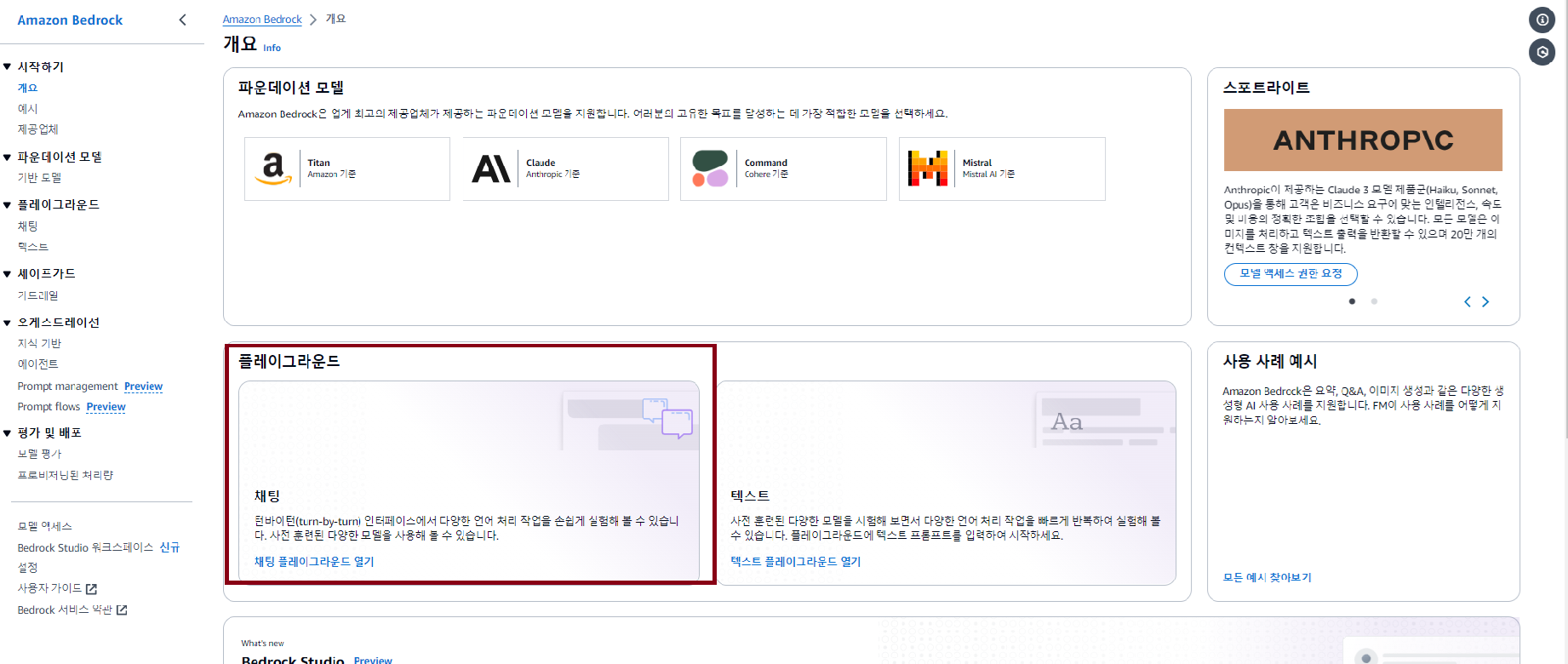 생성형 AI를 지원하는 다양한 서비스들이 있지만, 그나마 접하기 편하고, 기존에 사용하고있던 계정이 있어서 AWS의 Bedrock을 사용하기로 하였다.