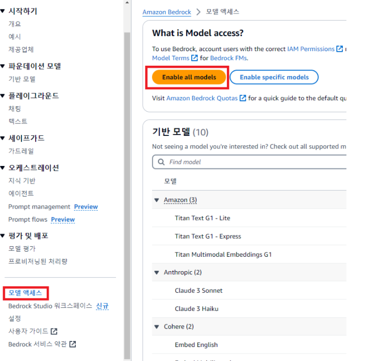 좌측 하단을 보면 "모델 액세스" 영역이 있다. 여기서 내가 사용할 파운데이션 모델에 권한을 요청하면 될 것 같다.