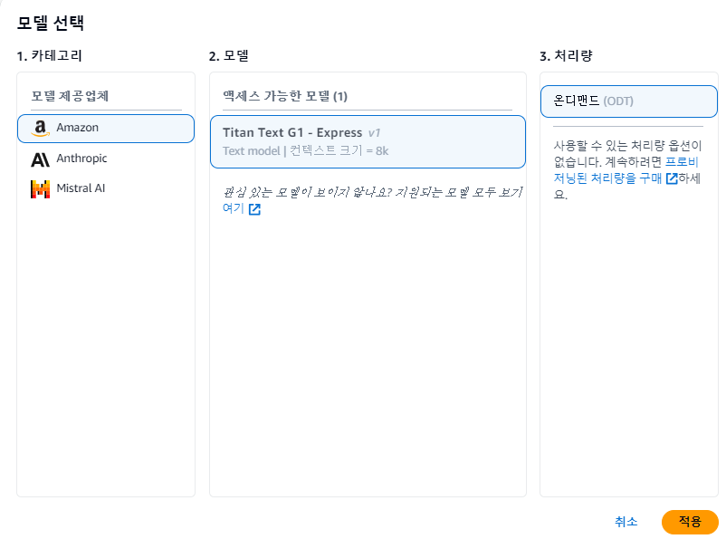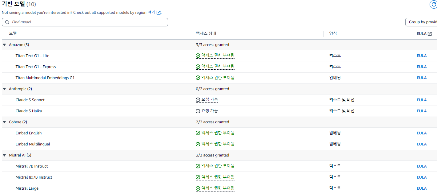 생성형 AI를 지원하는 다양한 서비스들이 있지만, 그나마 접하기 편하고, 기존에 사용하고있던 계정이 있어서 AWS의 Bedrock을 사용하기로 하였다.