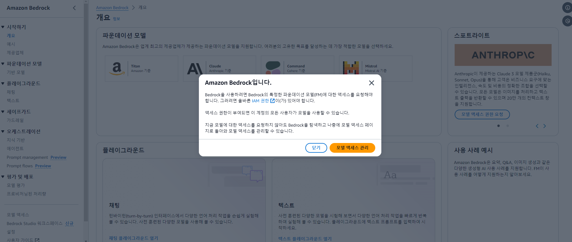 좌측 하단을 보면 "모델 액세스" 영역이 있다. 여기서 내가 사용할 파운데이션 모델에 권한을 요청하면 될 것 같다.