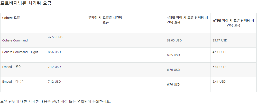 | 온디멘 | 온디맨드 모드에서는 기간 약정 없이 사용한 만큼만 비용을 지불하면 됩니다. - 텍스트 생성 모델의 경우 처리된 모든 입력 토큰과 생성된 모든 출력 토큰에 대해 요금이 부과됩니다. - 임베딩 모델의 경우 처리된 모든 입력 토큰에 대해 요금이 부과됩니다. 토큰은 몇몇 문자로 구성되며 모델이 사용자 입력과 프롬프트를 이해하기 위해 학습하는 기본 텍스트 단위를 나타냅니다. - 이미지 생성 모델의 경우 생성된 모든 이미지에 대해 요금이 부과됩니다. |