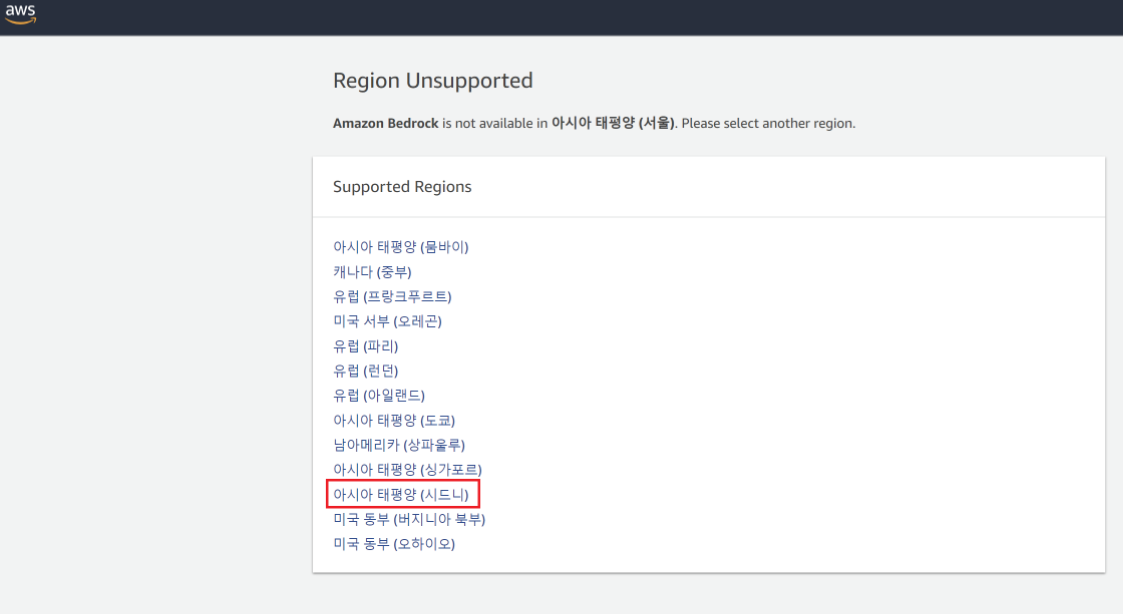 - 현재 Bedrock은 한국을 제외한 일부 지역에서만 사용 가능하기 때문에 시드니로 작업 진행