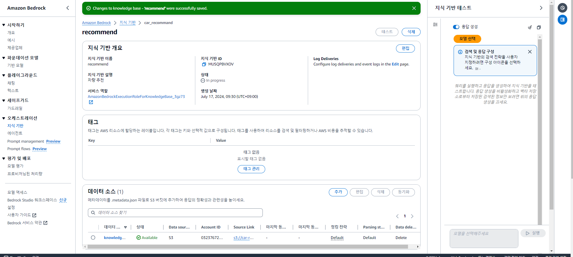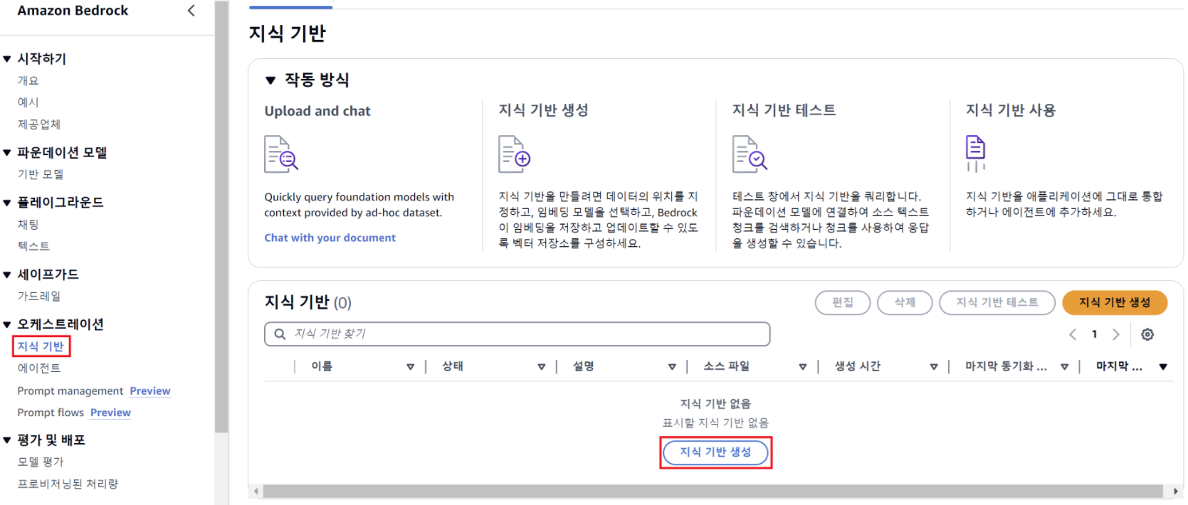 Bedrock > 오케스트레이션 > 지식 기반 > 지식 기반 생성
