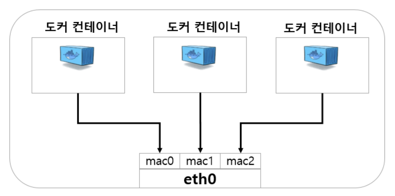 일단 호스트 머신에 물리 장비 NIC인 eth0은 당연히 존재한다. 그럼 eth0에서 여러 개의 하위 인터페이스를 만듦으로써 동시에 여러 개의 맥 주소를 가질 수 있도록 구축한다. 그리고 나서 그 서브 인터페이스에 여러 개의 컨테이너들이 주렁주렁 달리면서 VLAN을 구성할 수 있게 된다. 즉, macvlan 이라는 이름이 암시하듯이, 하나의 네트워크 인터페이스 카드를 가상화함으로써 여러 개의 맥주소를 양산하는 것이다.