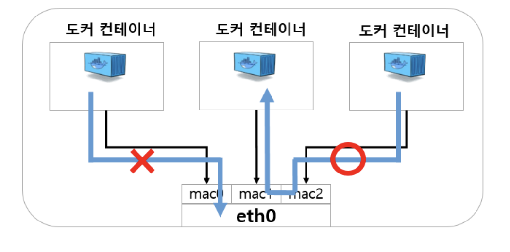 즉 브릿지는 각 컨테이너들의 맥 주소와 IP를 내부 테이블에 저장시켜놓음으로써 패킷 프레임이 정상적으로 왔다갔다 주고받고 얼씨구 할 수 있도록 하는, 2계층 디바이스를 연결할 수 있도록 하는 장비(?) 라고 보면 된다. 그렇지만 macvlan은 어찌보면, 브릿지와 완전 상반된다고 볼 수 있는 구조를 가진다.