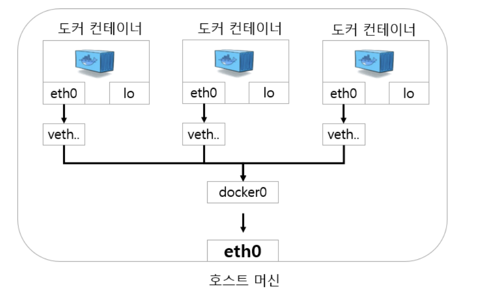 컨테이너를 생성하면 컨테이너의 namespace에 가상 인터페이스인 eth0이 생성되고, 호스트에는 veth를 접두어로 갖는 네트워크 인터페이스가 생성되며 이 두 개가 연결된다. 그리고 중요한 점은, 각 veth는 docker0라는 이름의 브릿지에 연결됨으로써 외부와 통신할 수 있다.