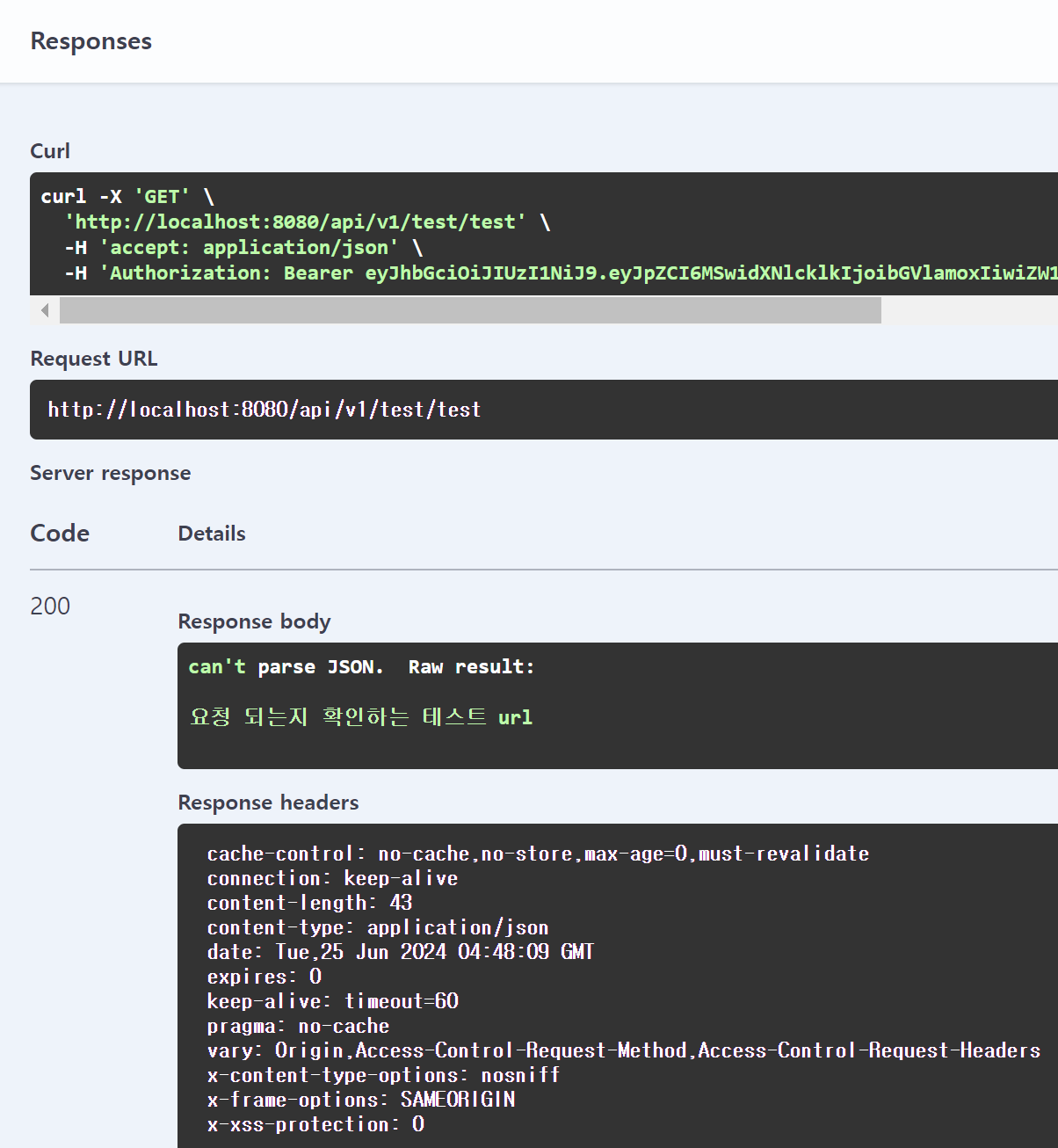 - swagger 접속 후 TestController로 요청하였을때 응답이 요청되면 안됨!