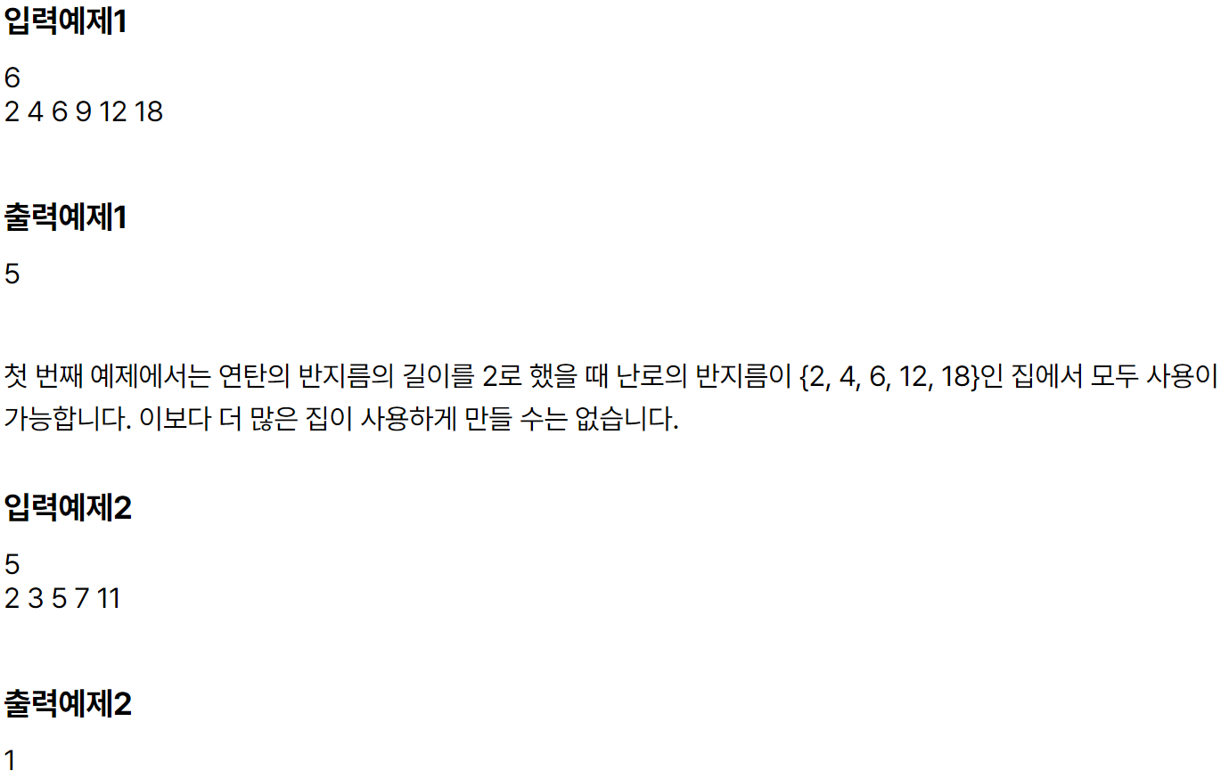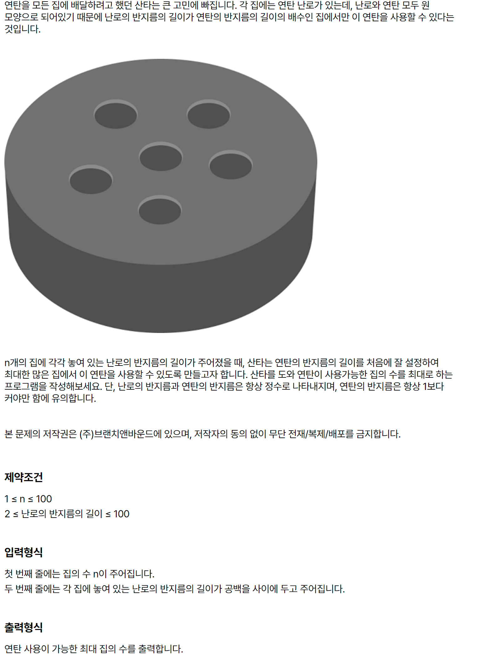 각 수들의 약수를 구하여 가장 많이 나온 약수의 갯수를 연탄의 반지름으로 잡기로 하였다.