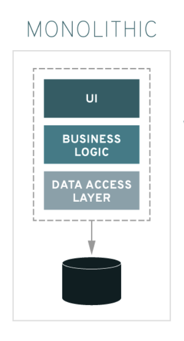 즉, 소프트웨어의 모든 구성요소(사용자 인터페이스, 데이터베이스, 어플리케이션 3티어)가 한 프로젝트에 통합 되어 있는 형태 이다.