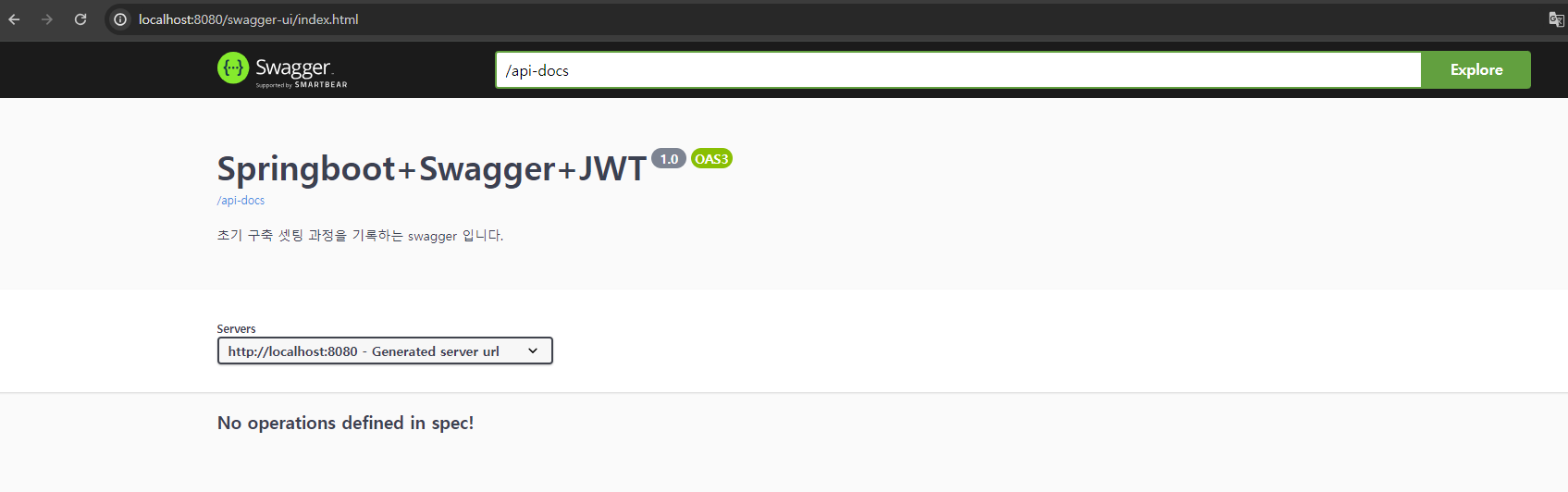 이제 localhost:8080/swagger.html 로 접속하면 기본 페이지가 뜬다.