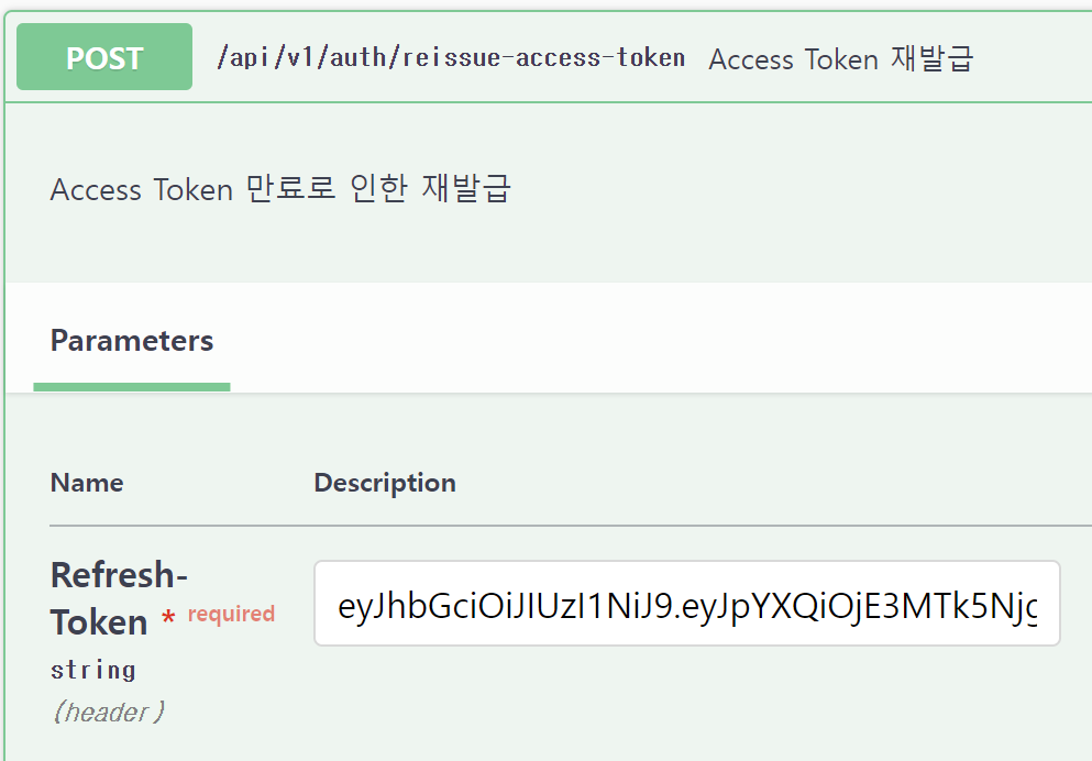 - Swagger 상단에 Authoriz 에 Access Token 입력 후 요청